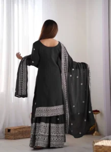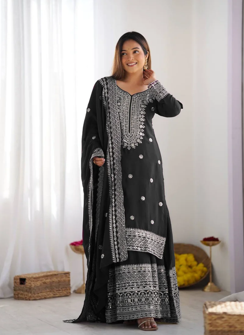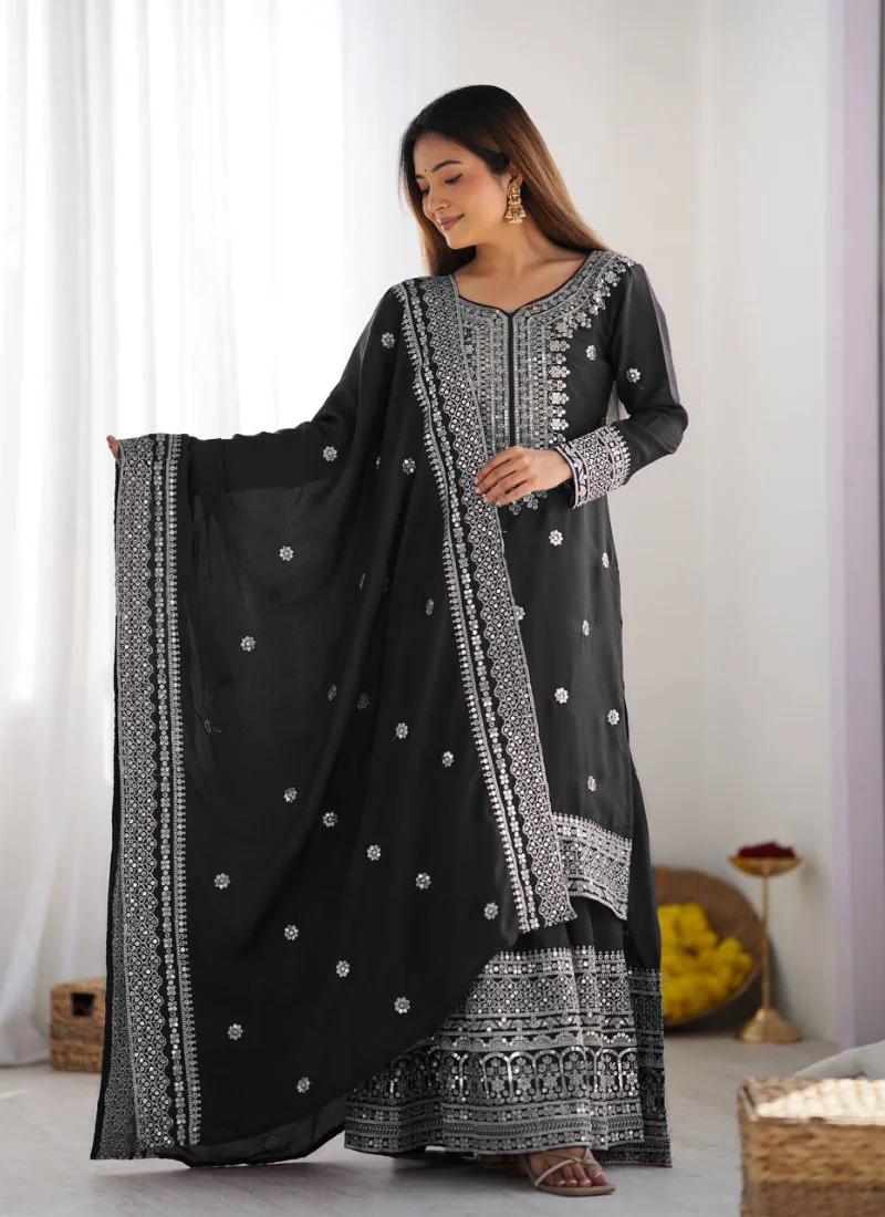 This chinnon silk sharara suit in Black is designed to bring a polished festive look with graceful movement and ready-to-wear comfort. Crafted with Pure Heavy Chinnon Silk with Embroidery and 5mm Sequence Work, the coordinated set delivers a refined ethnic silhouette that works beautifully for celebrations, festive gatherings, family functions, and statement occasion dressing.