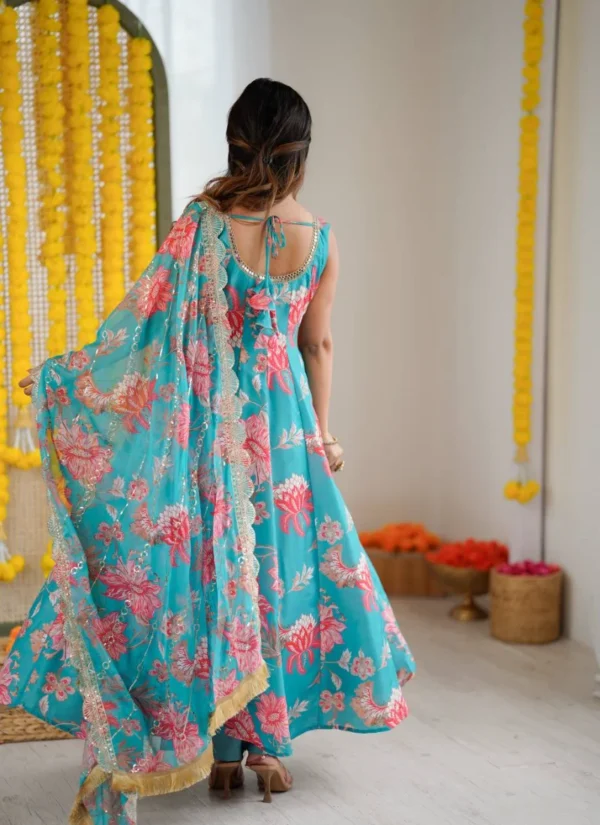 Product Highlights: A complete ethnic outfit, the Blue Muslin Print Gown Set features embroidery & sequence work with elegant border lace, a length of 48–49 Inches (Approx.), Approx. 4 Meters with Kali Cut and an elegant finish for special events.
