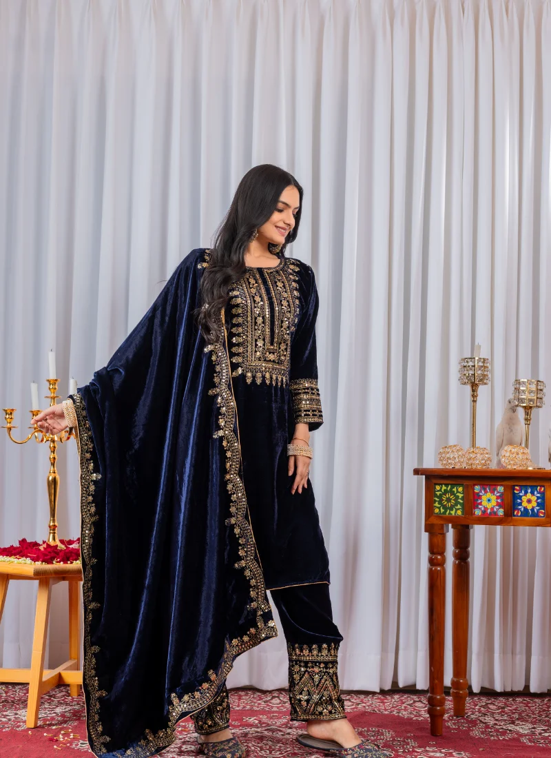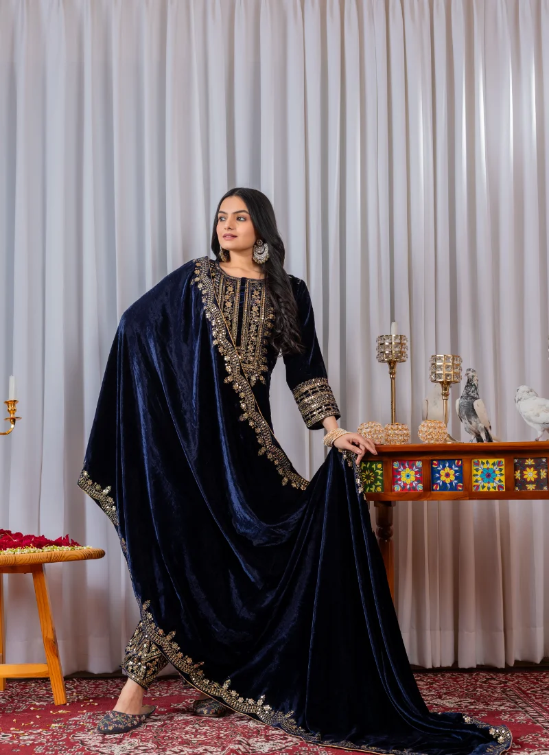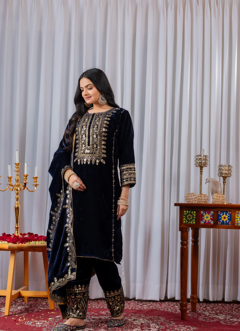The main ensemble features Viscose Velvet with 5 MM Embroidery Sequen, while the set is complemented by Viscose Velvet with 5 MM Embroidery Sequen and Viscose Velvet with 5 MM Embroidery Sequen dupatta. Refined ethnic detailing. Designed as a ready-to-wear set.