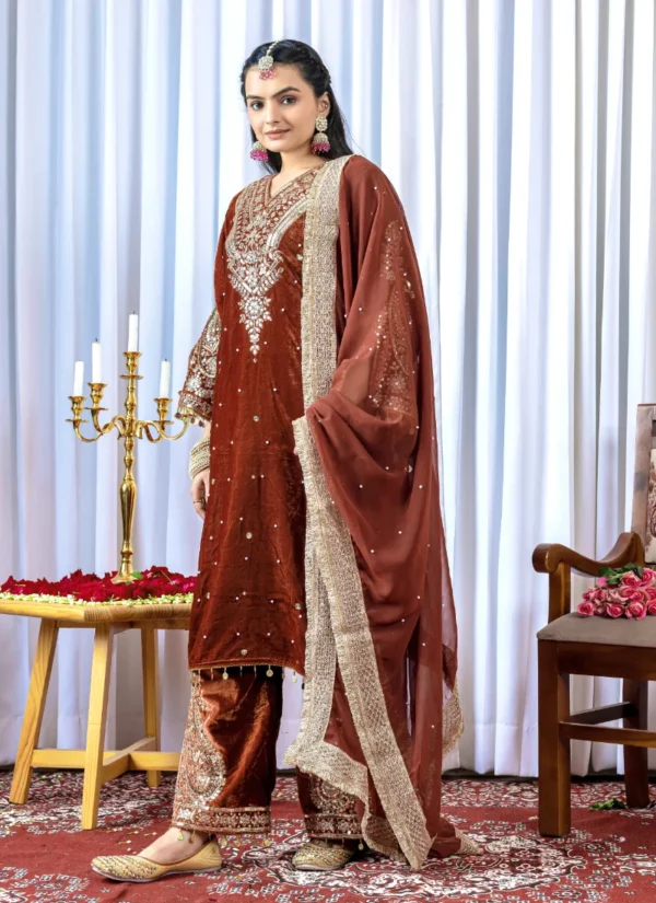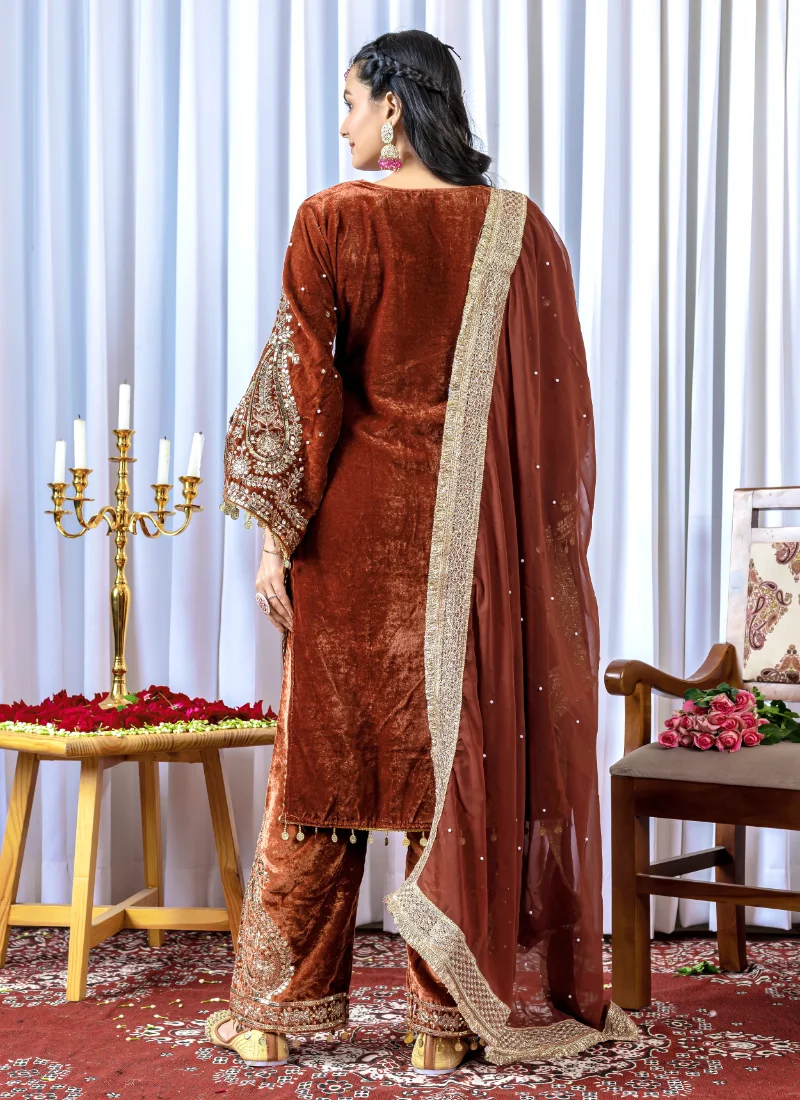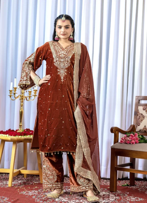 Product NameBrown Viscose Velvet Lace Work Suit Set