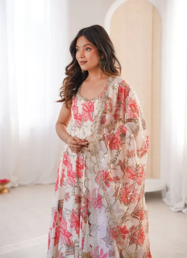 Product Highlights: The Cream Muslin Print Gown Set stands out with embroidery & sequence work with elegant border lace, a length of 48–49 Inches (Approx.), Approx. 4 Meters with Kali Cut and ready-to-wear convenience for festive functions, family events, and celebratory outings.