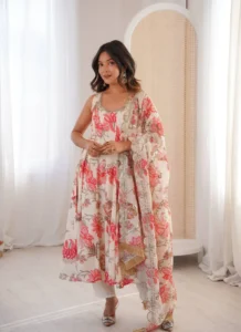 Make a graceful statement in this Cream Muslin Print Gown Set, crafted for festive dressing and polished day-to-evening styling.