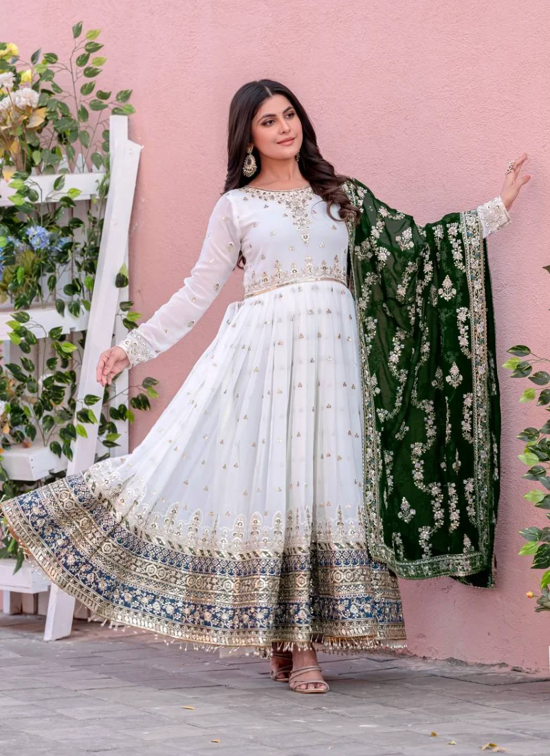 The faux georgette base gives the outfit a fluid drape, while the embroidered finish enhances its festive appeal. Designed in a flattering anarkali silhouette, this set offers a polished ethnic look that works beautifully for parties, celebrations, and wedding functions.