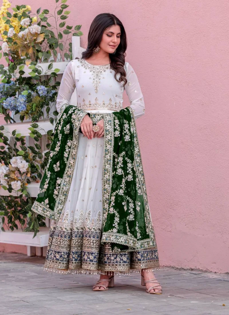 Make a refined festive statement with this Green Faux Georgette Embroidered Anarkali Gown Set, tailored to deliver graceful movement, rich detailing, and occasion-ready elegance.