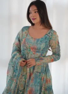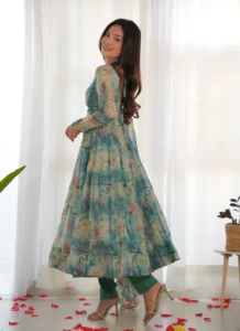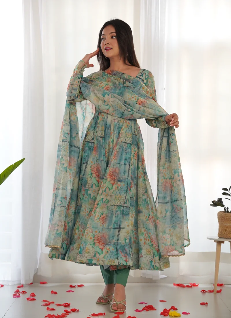 Add standout elegance to your wardrobe with this Green Organza Silk Anarkali Set, tailored to look occasion-ready with minimal effort.