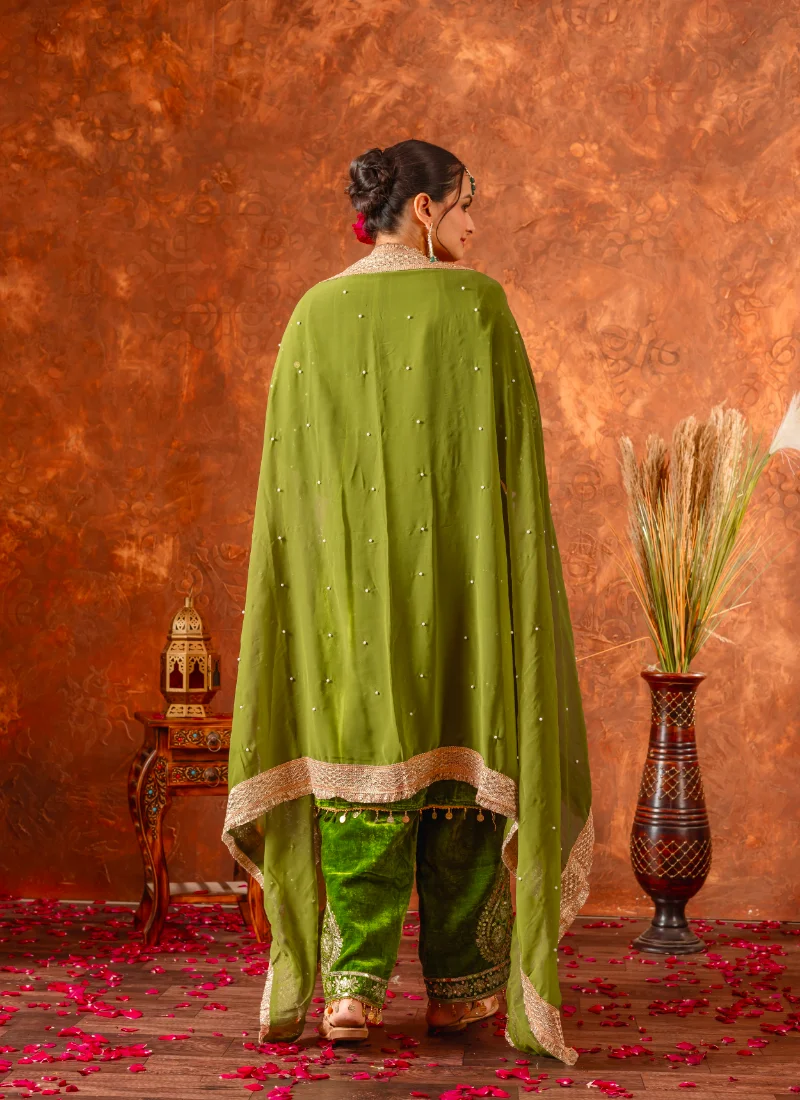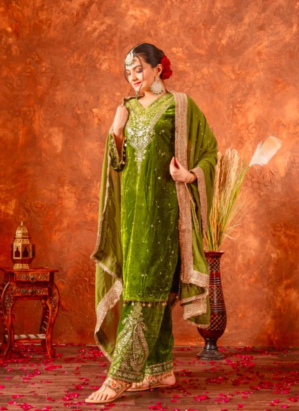 Product NameGreen Viscose Velvet Lace Work Suit Set