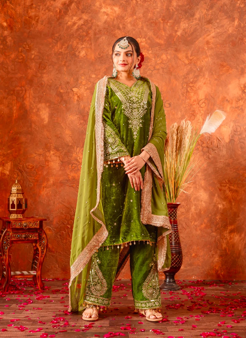 Created for celebrations and special gatherings, this Green Viscose Velvet Suit Lace offers a balanced mix of comfort, flow, and detail.