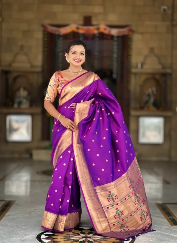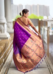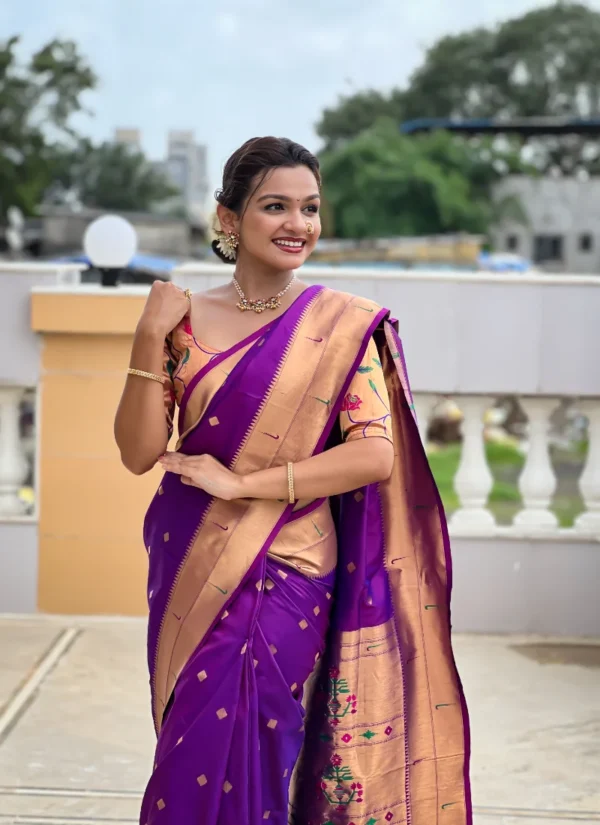 Work Soft Paithani silk saree with zari weaving Meenakari motifs design and Meenakari weaving Rich pallu with Meenakari weaving border & Tassels attached at Pallu end. Blouse :- Enrich silk weaving contrast blouse piece with sleeve border