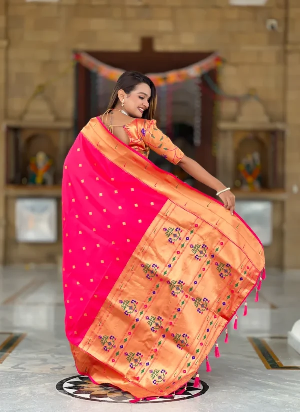WorkSoft Paithani silk saree with zari weaving Meenakari motifs design and Meenakari weaving Rich pallu with Meenakari weaving border & Tassels attached at Pallu end. Blouse :- Enrich silk weaving contrast blouse piece with sleeve border