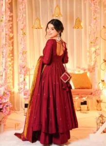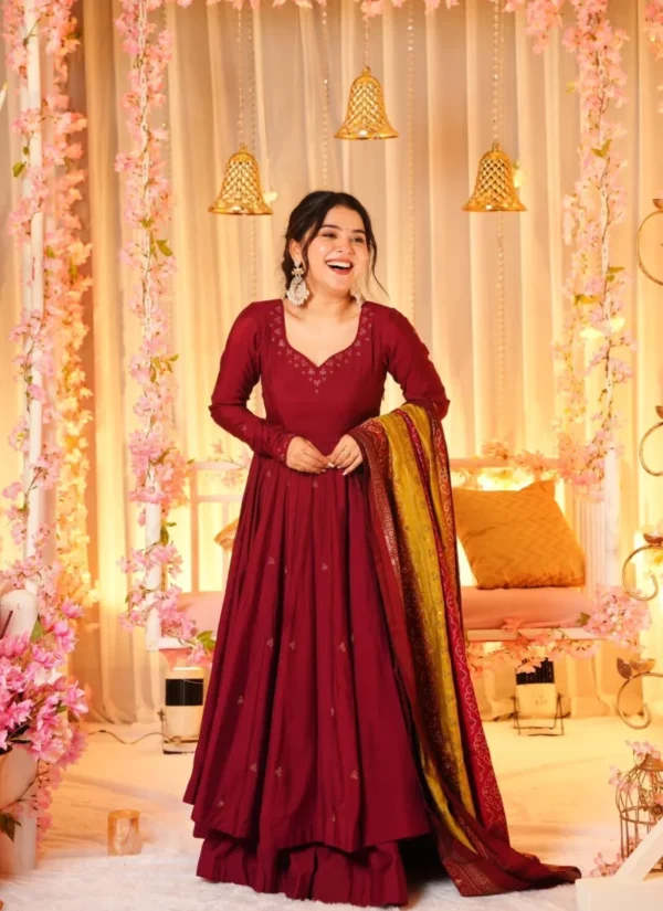 Perfect for festive gatherings, family functions, wedding events, and celebration wear, this Maroon Silk Embroidered Anarkali Suit is designed to deliver standout style with versatile elegance.
