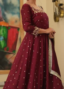 Crafted in Vichitra Silk, the set combines a flowy anarkali kurta with matching palazzo styling and dupatta coordination for a complete outfit. The embroidered finish and rich maroon tone make it a strong choice for festive functions, family celebrations, and party wear.