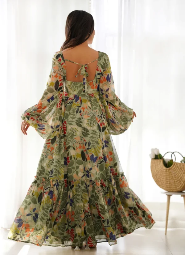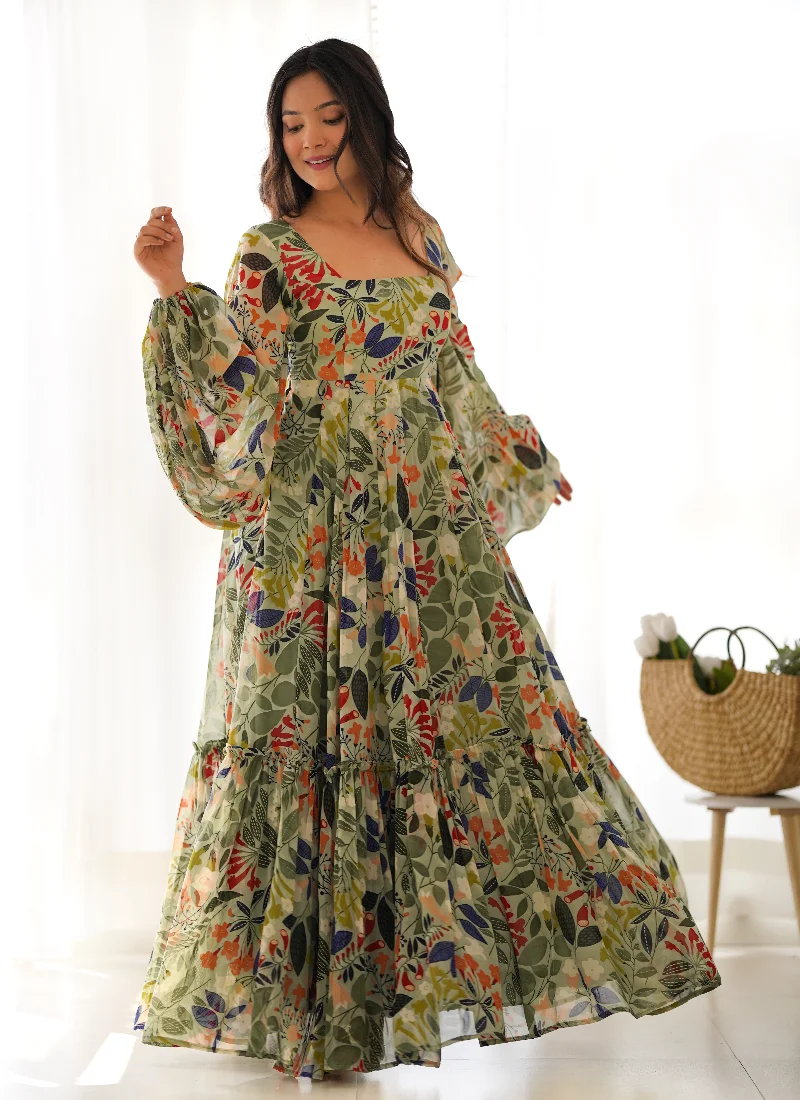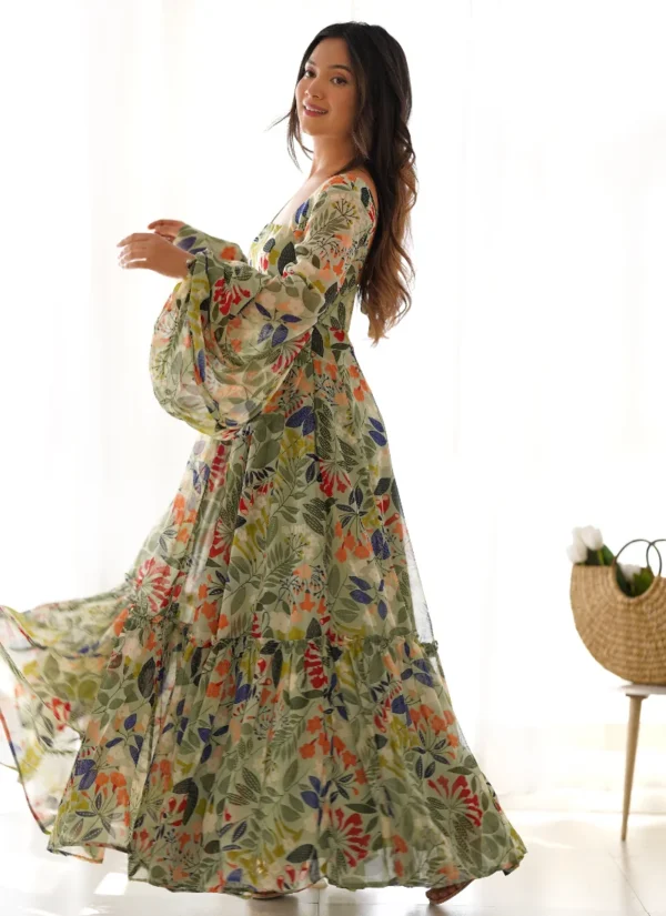 This Multicolor Fox Georgette Floral Print Maxi Gown is designed for effortless elegance, combining flowing movement, a flattering silhouette, and easy festive styling.