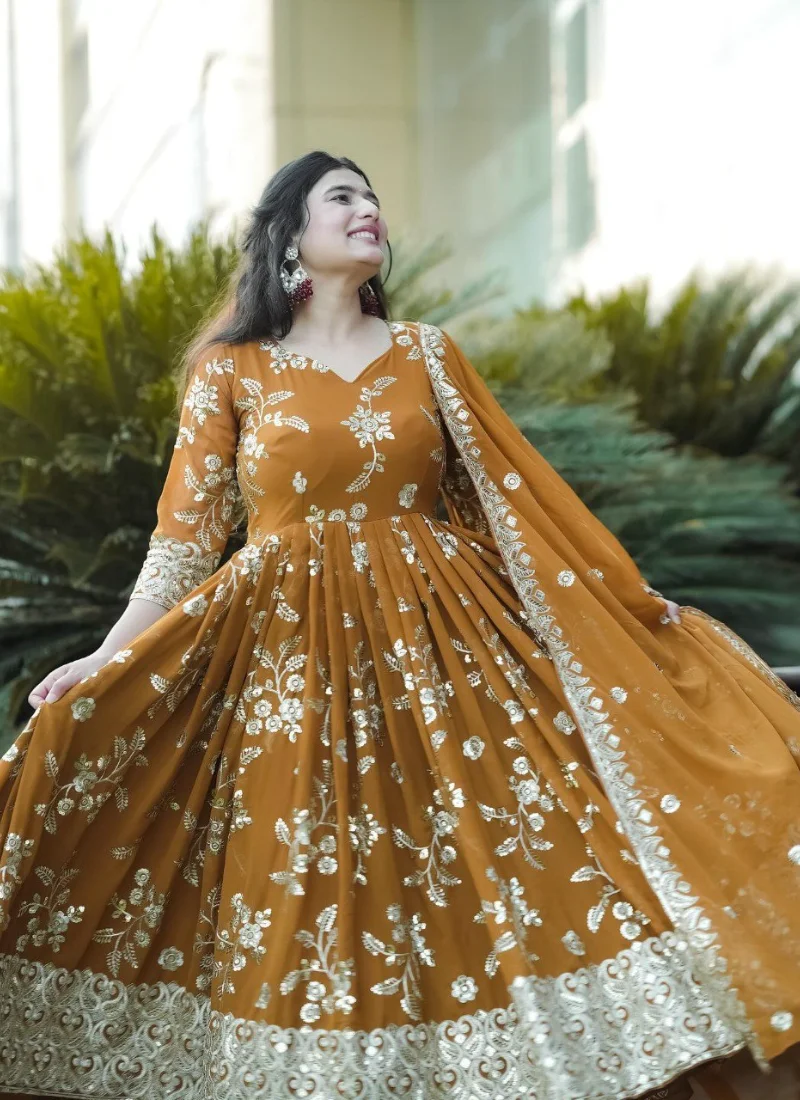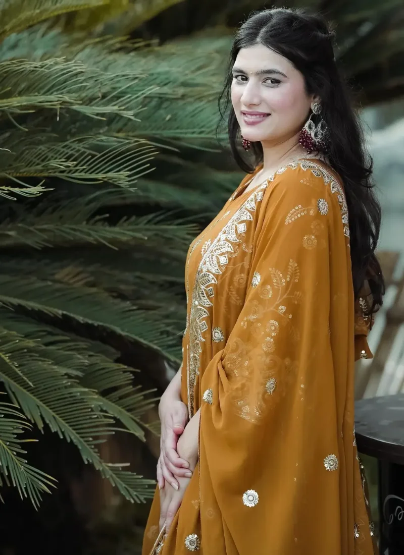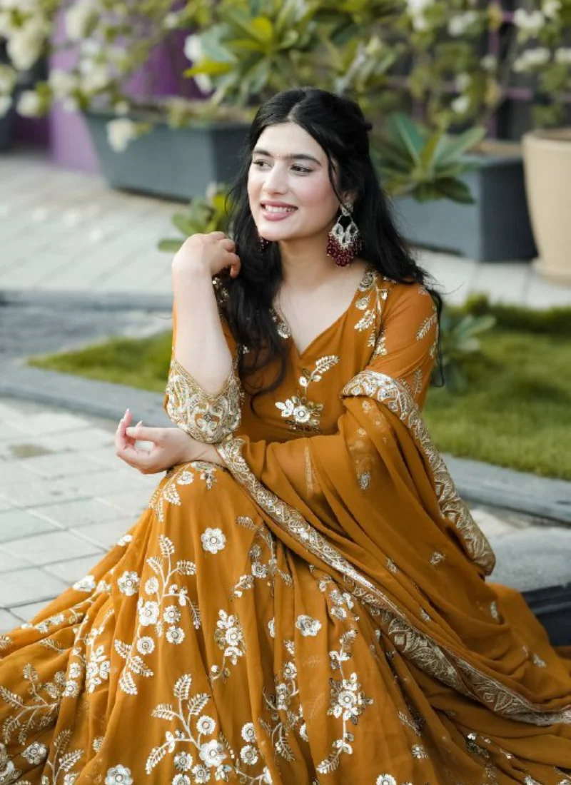 Whether styled for festive outings, party wear, or traditional celebrations, this Mustard Georgette Embroidered Anarkali Suit offers a premium ethnic look that feels timeless and easy to accessorize.