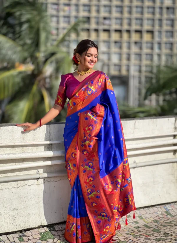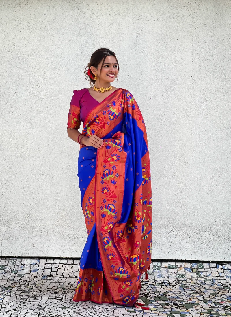 navy blue soft Paithani saree is crafted in exact saree fabric name “Soft Paithani silk saree with zari” and offers a graceful traditional drape with woven zari appeal. The saree showcases Meenakari motifs, a rich pallu, woven border detailing, and tassels at the pallu end for an elegant festive finish.