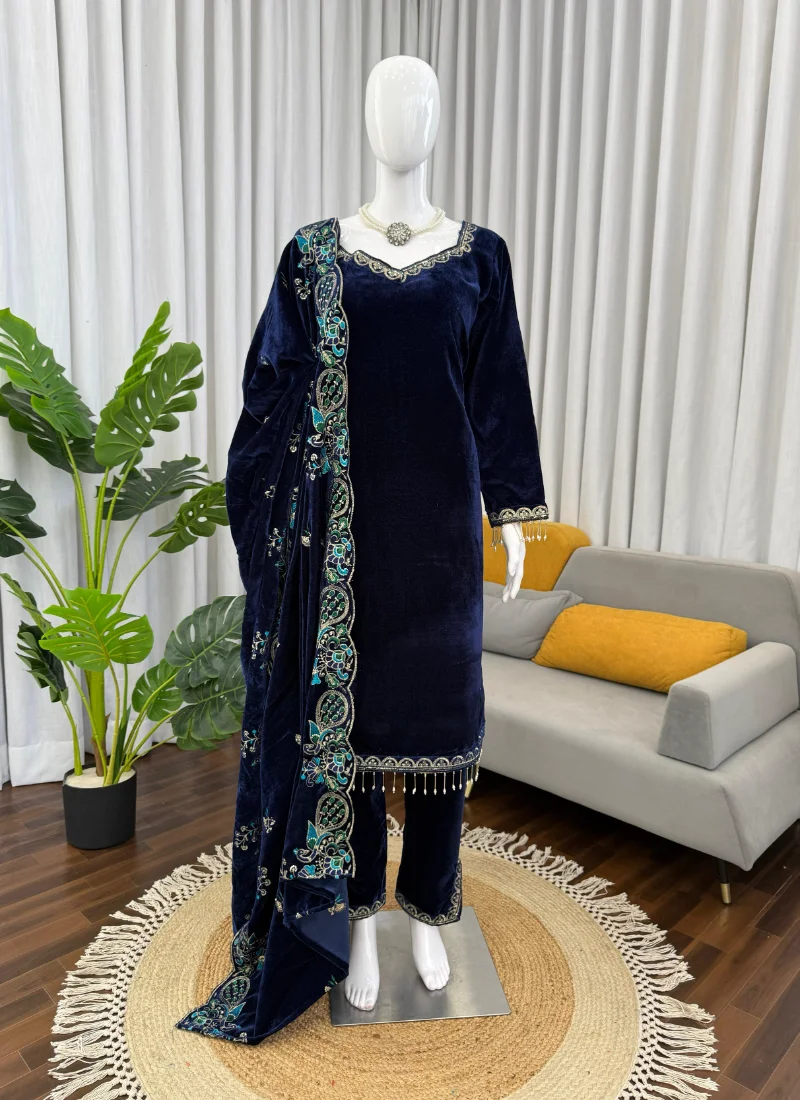 Product Highlights: Designed with thread & sequence work with fancy lace, thread with sequence work, the Navy Blue Viscose Velvet Suit combines a length of 43–44 Inches, coordinated styling and practical ready-to-wear styling for standout dressing.