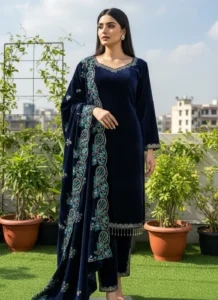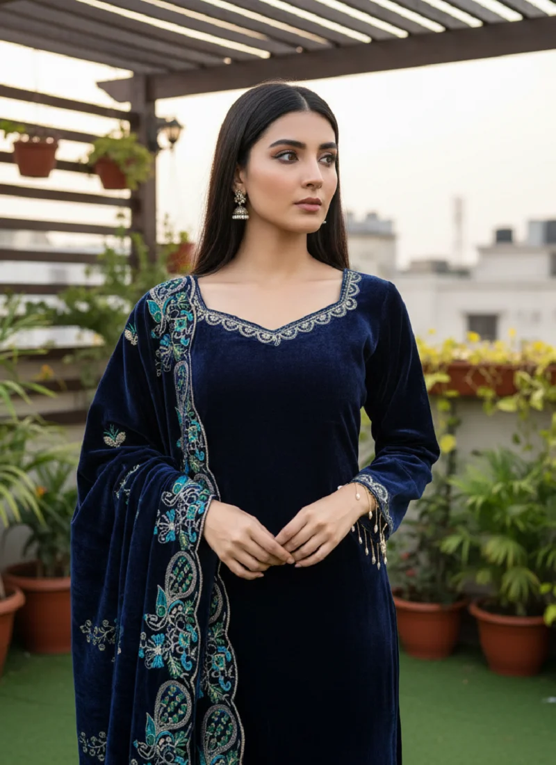 Created for celebrations and special gatherings, this Navy Blue Viscose Velvet Suit offers a balanced mix of comfort, flow, and detail.