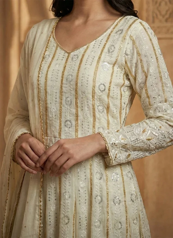 Perfect for festive gatherings, family functions, wedding events, and celebration wear, this Off White Faux Blooming Embroidered Anarkali Suit is designed to deliver standout style with versatile elegance.