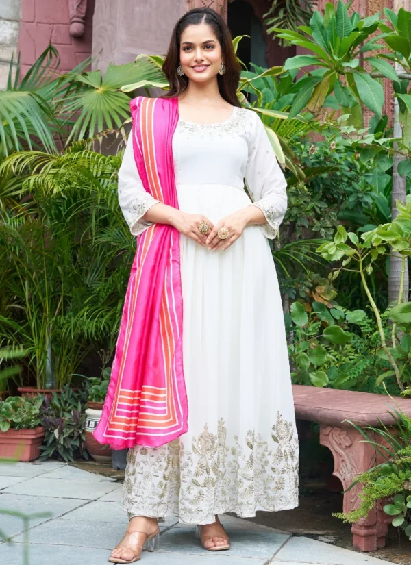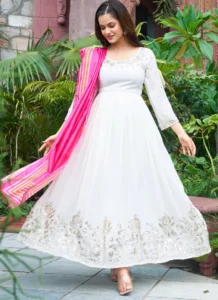 The fox georgette gown creates a polished ethnic look, while the coordinated pant balances the silhouette for easy movement and all-day wear. The embroidered appearance adds richness without overwhelming the outfit.