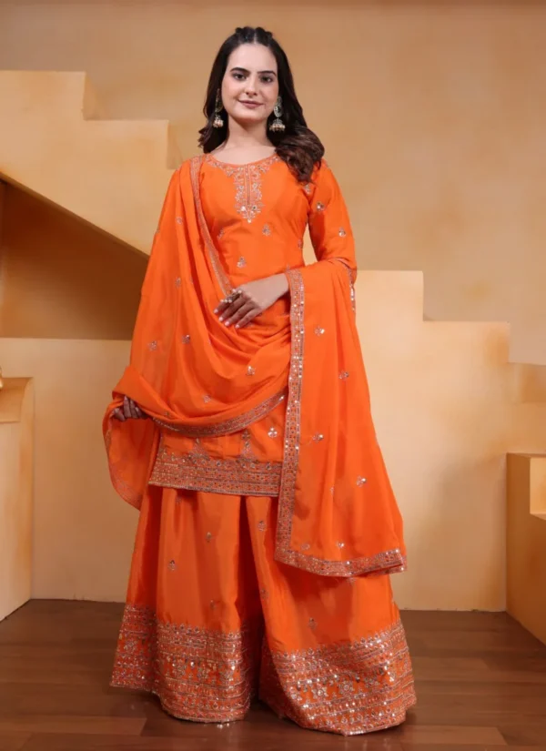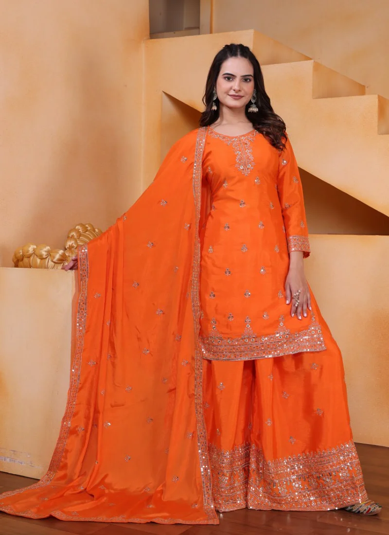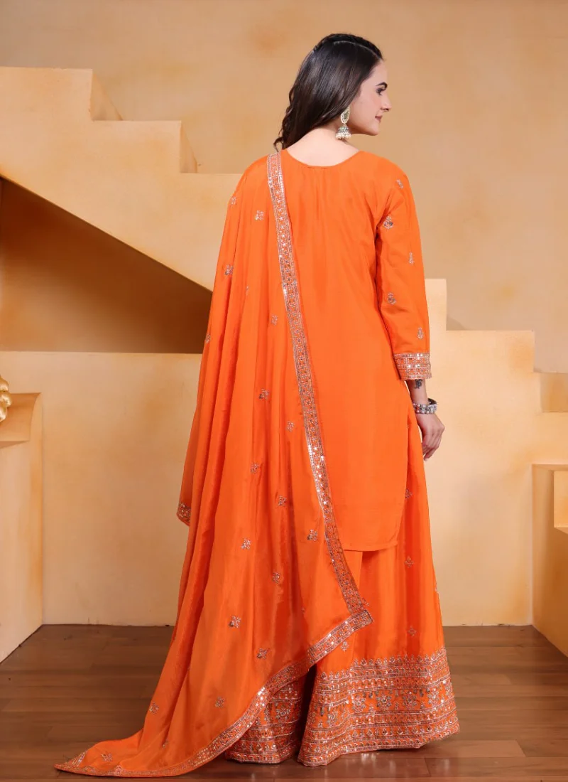 Perfect for festive gatherings, family functions, wedding events, and celebration wear, this Orange Chinon Embroidered Salwar Suit is designed to deliver standout style with versatile elegance.