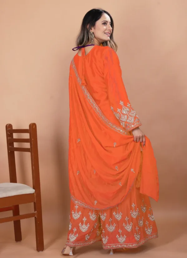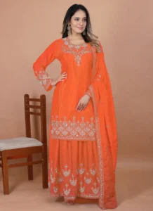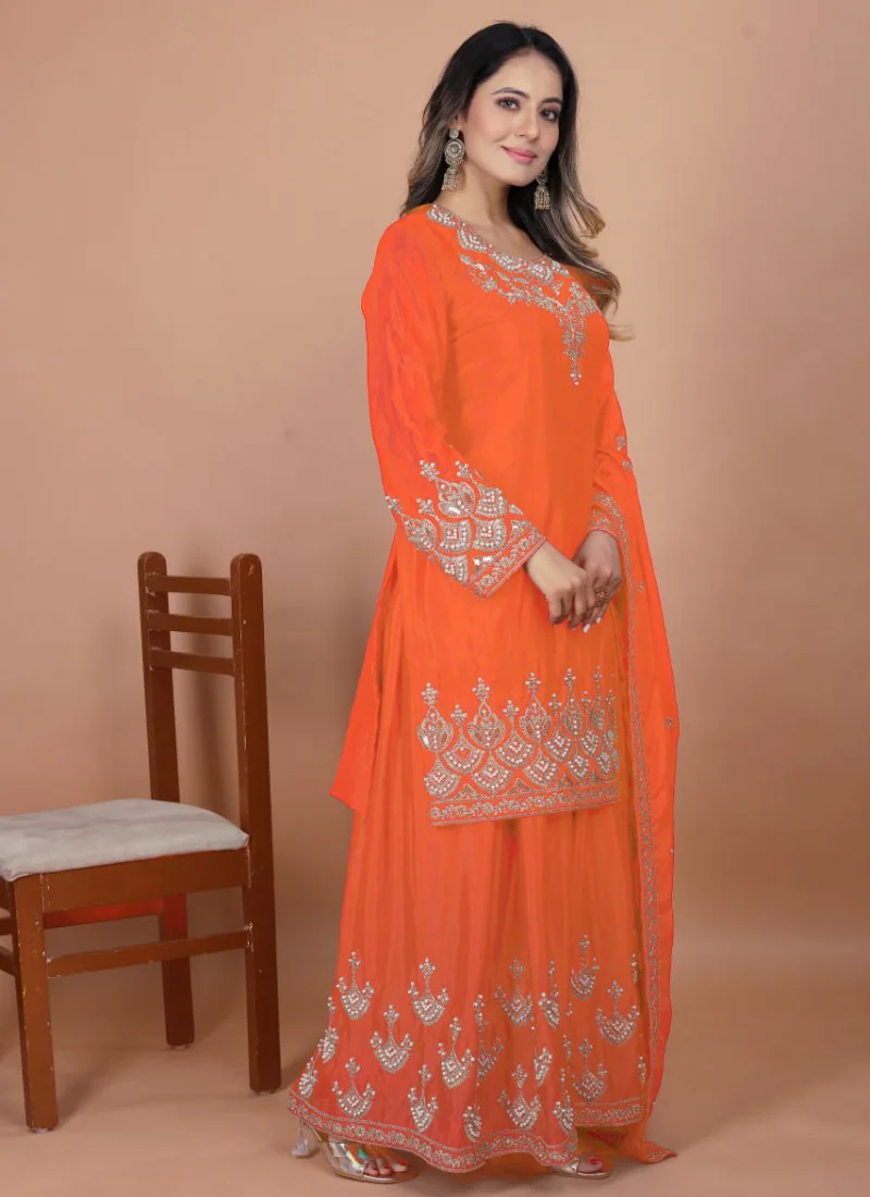 Whether styled for festive outings, party wear, or traditional celebrations, this Orange Chinon Embroidered Salwar Suit offers a premium ethnic look that feels timeless and easy to accessorize.