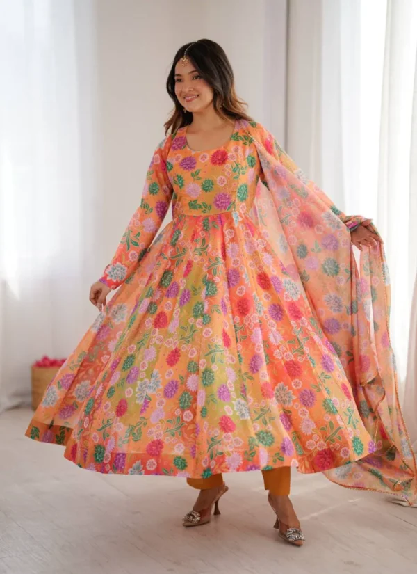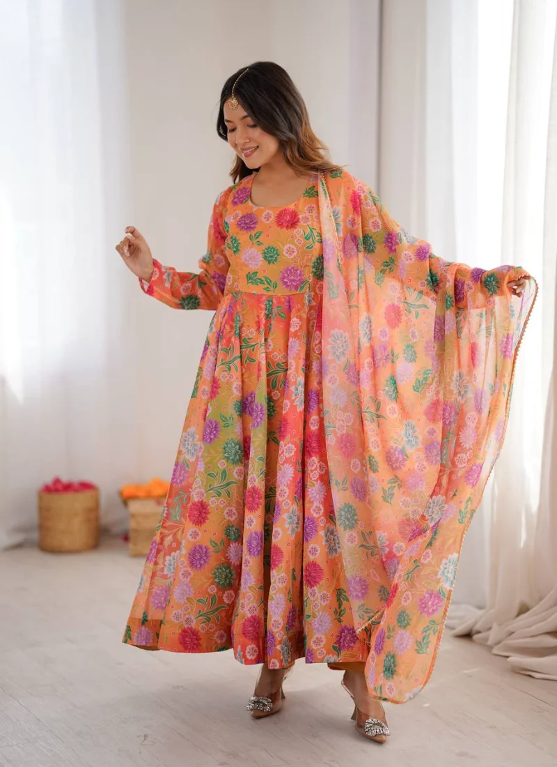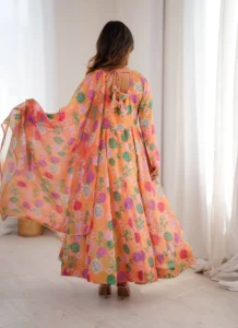 Product NameOrange Organza with Floral Print Lace Work Gown Set