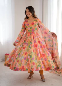 This Orange Organza with Gown Set brings together refined fabric, thoughtful finishing, and an easy ready-to-wear silhouette.