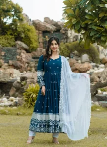 Crafted for a rich ethnic look, the kurta showcases embroidery accents and a well-structured fall. Paired with a coordinated bottom and elegant dupatta, the set creates a complete outfit that feels occasion-ready without compromising comfort.