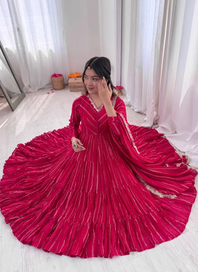Product Highlights: From real mirror with handwork, mirror work lace border to its coordinated styling, the Pink Mal Chanderi Ruffle Gown delivers a length of 47–48 Inches, 12 Meter and occasion-ready appeal in one set.