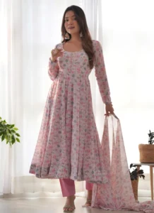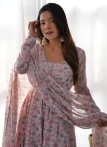 Created for celebrations and special gatherings, this Pink Orange Chiffon Anarkali Set offers a balanced mix of comfort, flow, and detail.