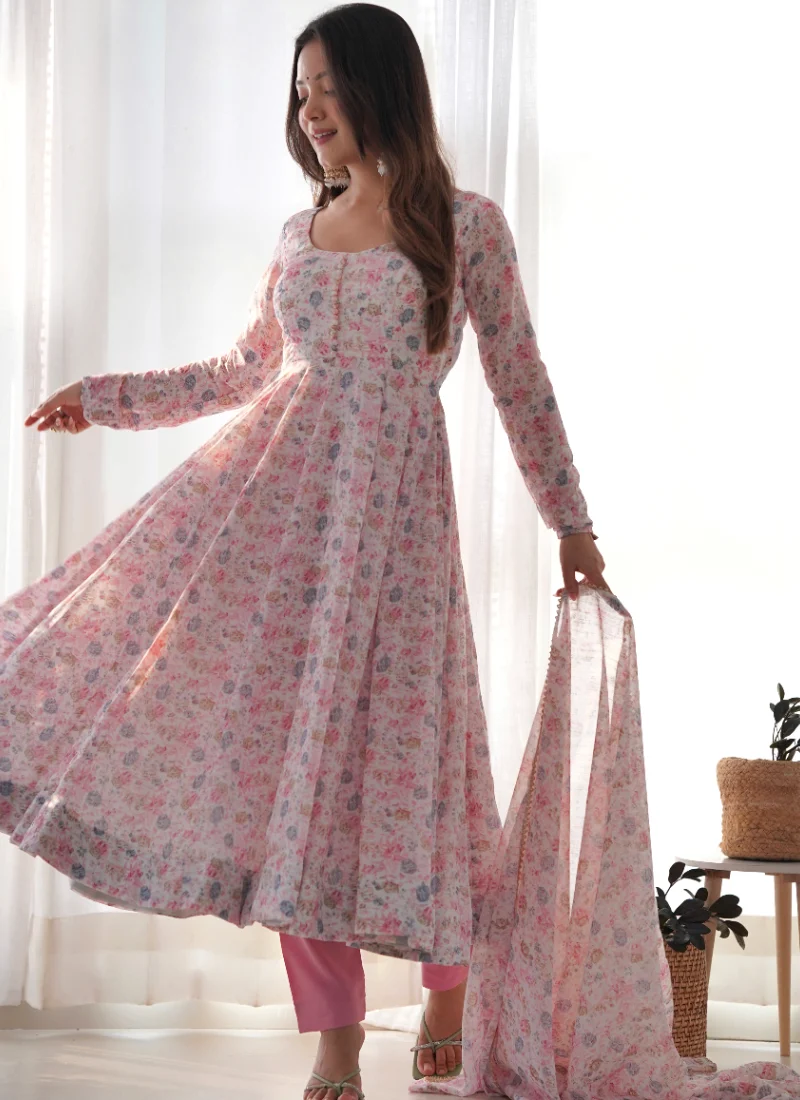 Product Highlights: Designed with fancy neck with potli button design, zipper attached, the Pink Orange Chiffon Anarkali Set combines a length of Approximate Length: 48 inches, Approximately 4 meters, fully flared design and practical ready-to-wear styling for standout dressing.