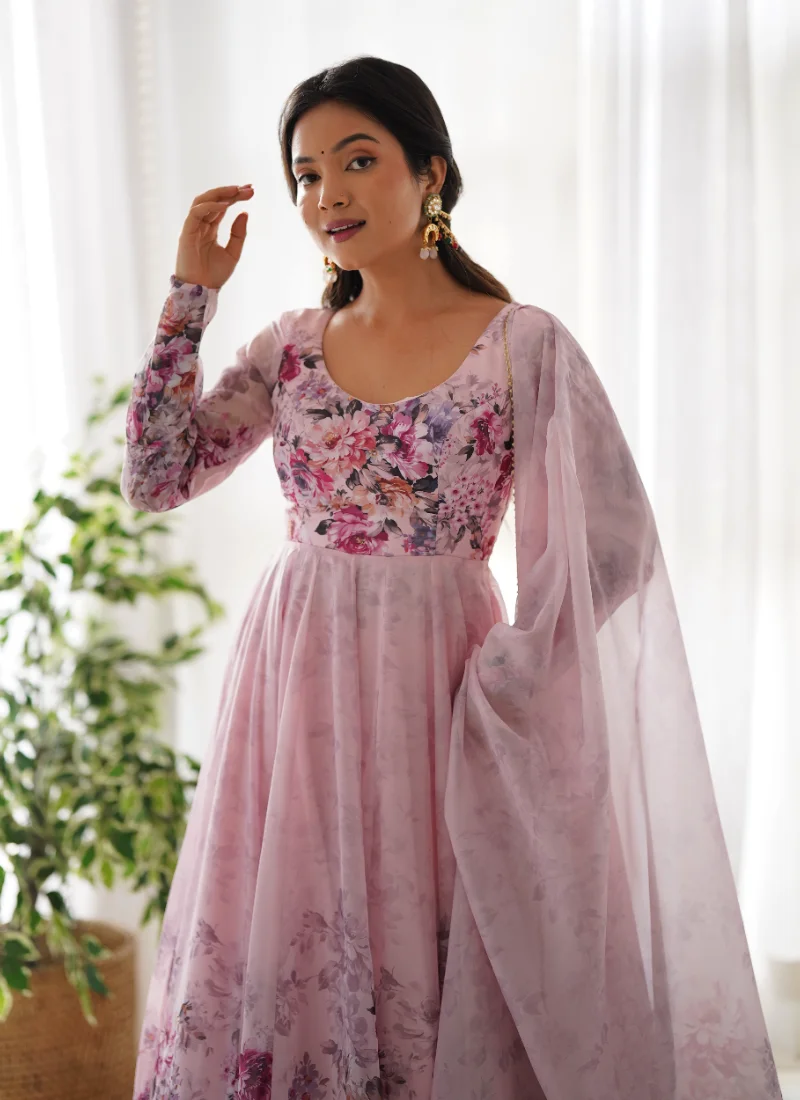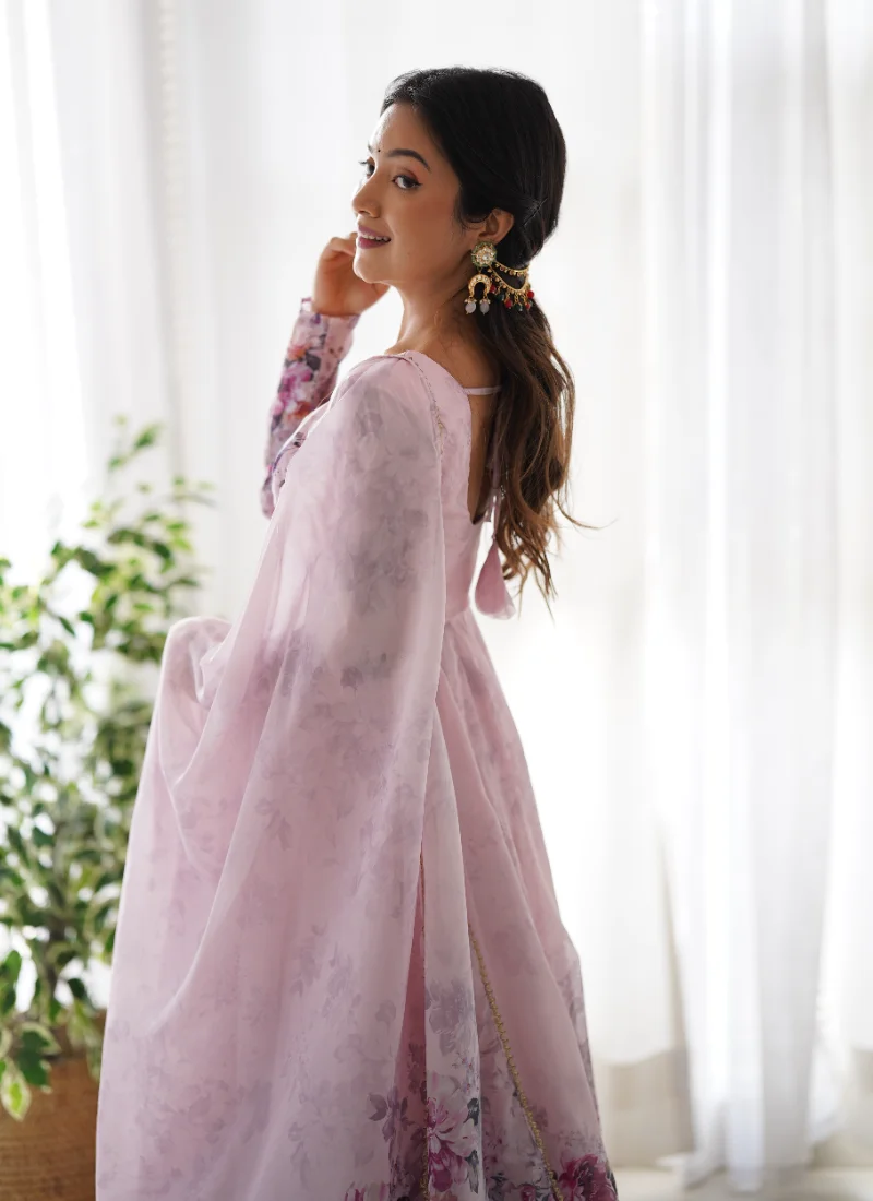 Product NamePink Organza Silk Print Lace Work Anarkali Set