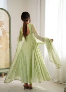 Make a graceful statement in this Pista Green Blooming Faux Anarkali, crafted for festive dressing and polished day-to-evening styling.