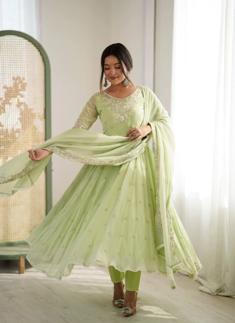Product Highlights: The Pista Green Blooming Faux Anarkali stands out with heavy embroidery rainbow sequence with moti work, a length of 48–49 inches, 6 meters and ready-to-wear convenience for festive functions, family events, and celebratory outings.