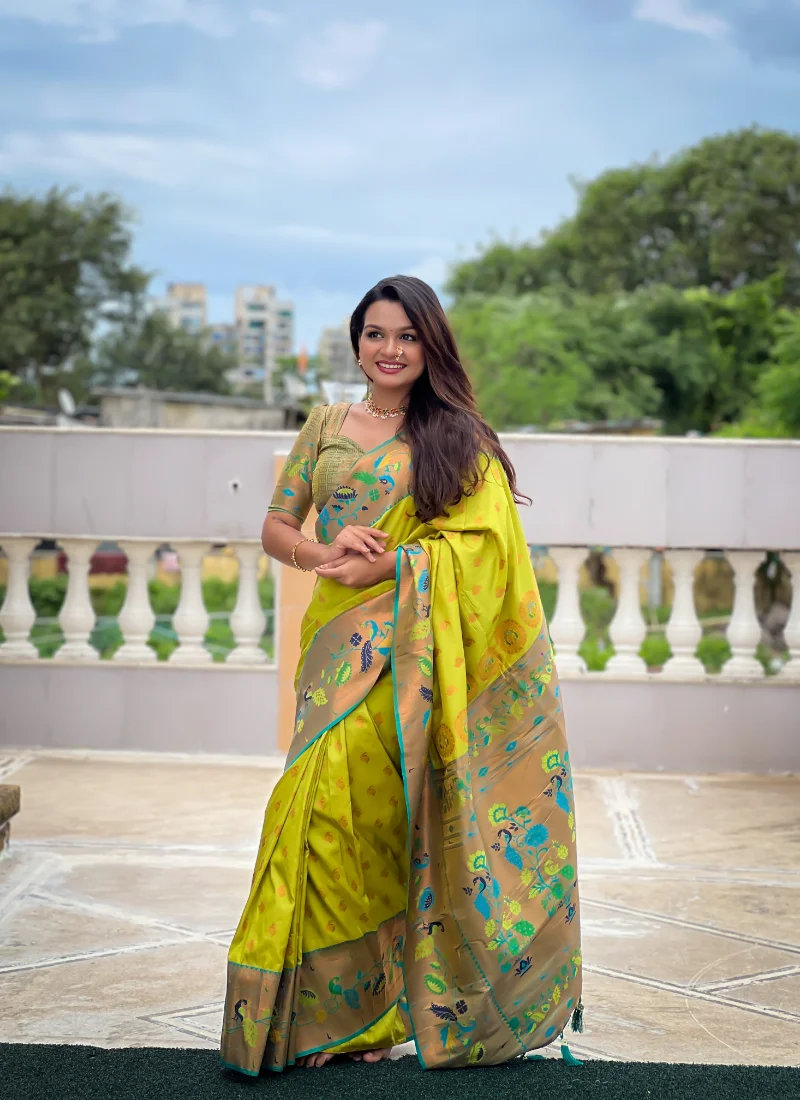 This saree includes a coordinated blouse piece in exact blouse fabric name “Soft Paithani silk saree with zari” for a complete ethnic ensemble. The detailed weaving and statement pallu make this pista soft Paithani saree ideal for weddings, festive occasions, family gatherings, and gifting.