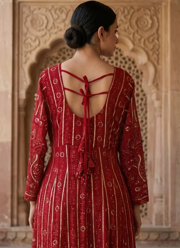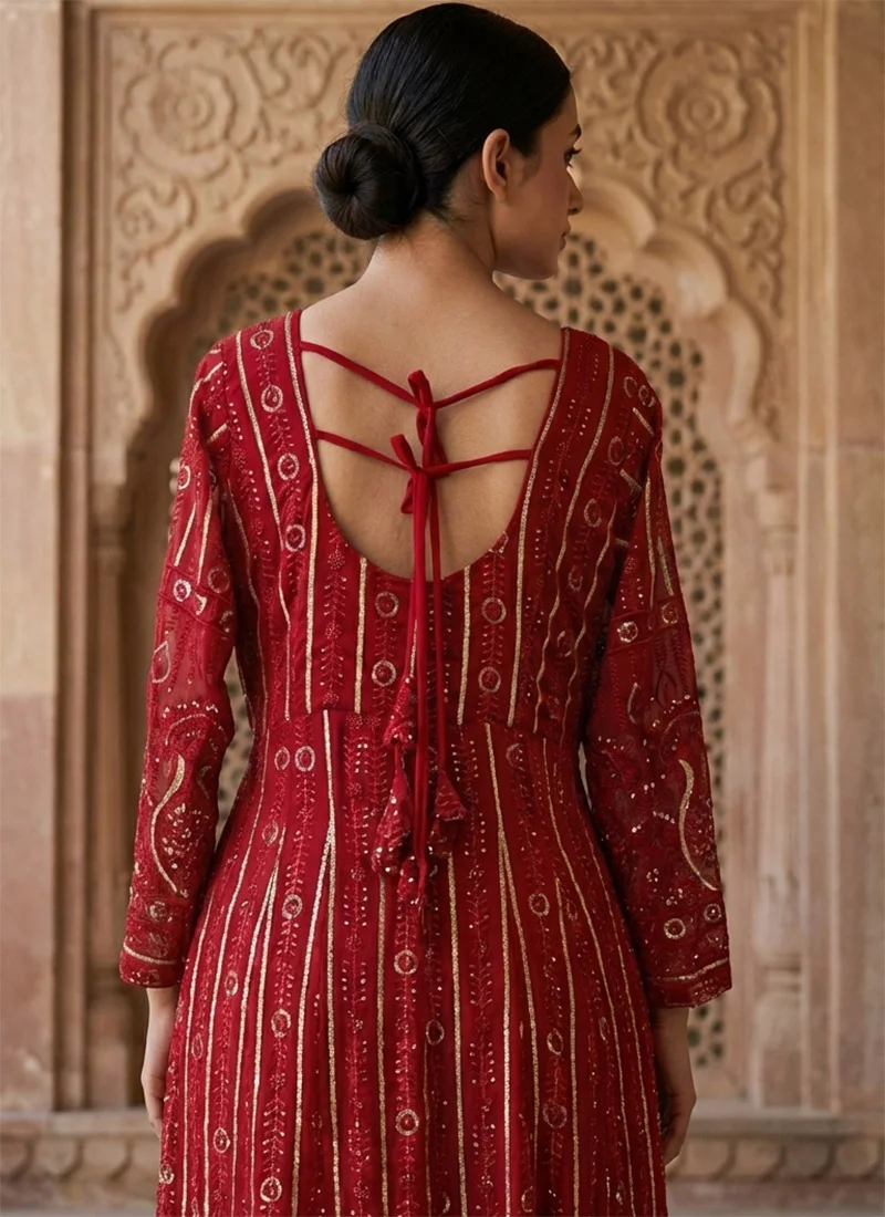 This Red Faux Blooming Embroidered Anarkali Suit is a flattering wardrobe essential that blends premium fabric, polished detailing, and easy wearability.