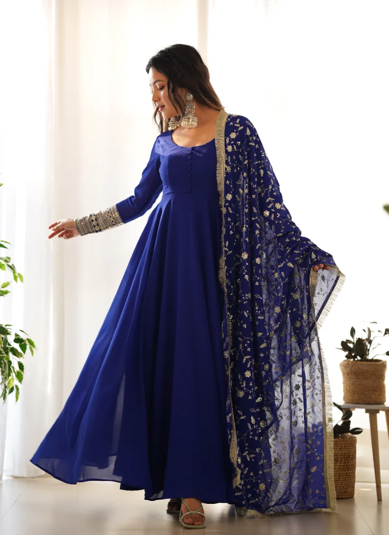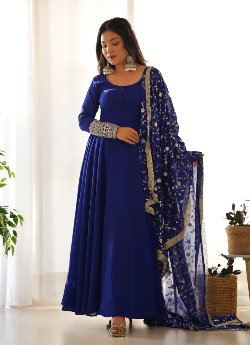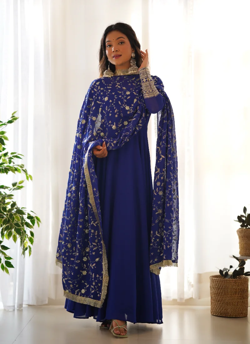 Product Highlights: From neck potli design, embroidery sequence and jari work, with border fancy lace work to its coordinated styling, the Royal Blue Fox Georgette Gown delivers a length of Approximate Length: 53 to 54 inches, 7 meters plus flair and occasion-ready appeal in one set.