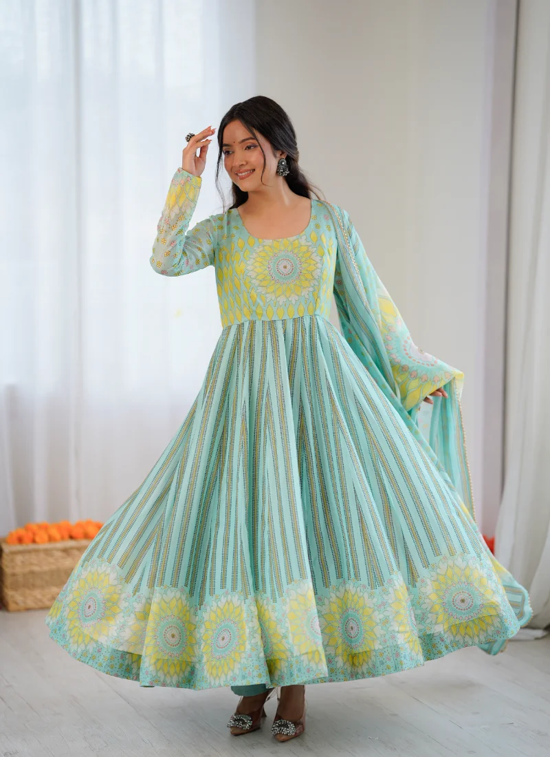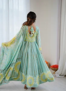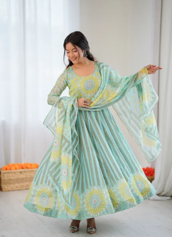 Created for celebrations and special gatherings, this Sea Green Organza with Gown offers a balanced mix of comfort, flow, and detail.