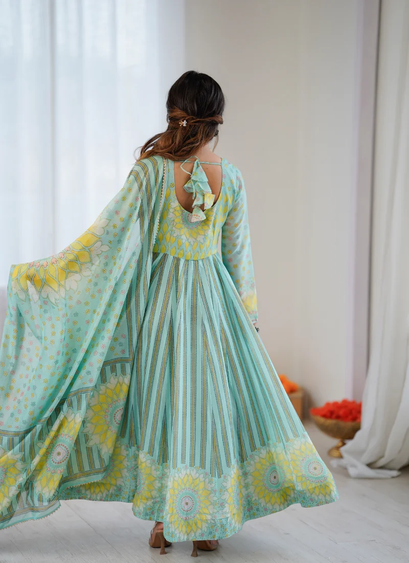Sea Green Organza with Floral Print Lace Work Gown Set