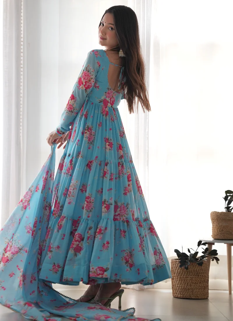 This Sky Blue Fox Georgette Anarkali brings together refined fabric, thoughtful finishing, and an easy ready-to-wear silhouette.