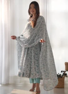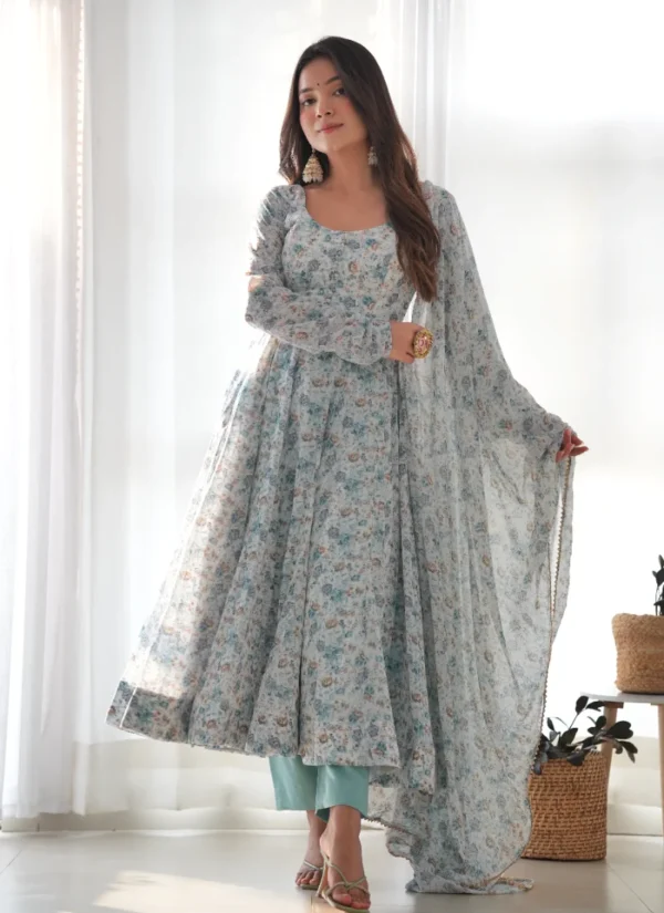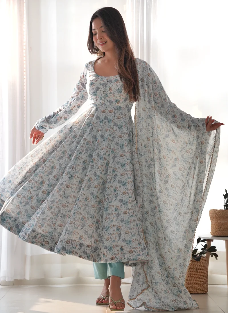 The Sky Blue Orange Chiffon Anarkali is a versatile festive pick that pairs premium fabric with graceful movement and coordinated pieces.