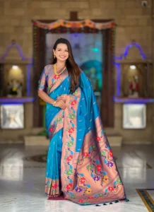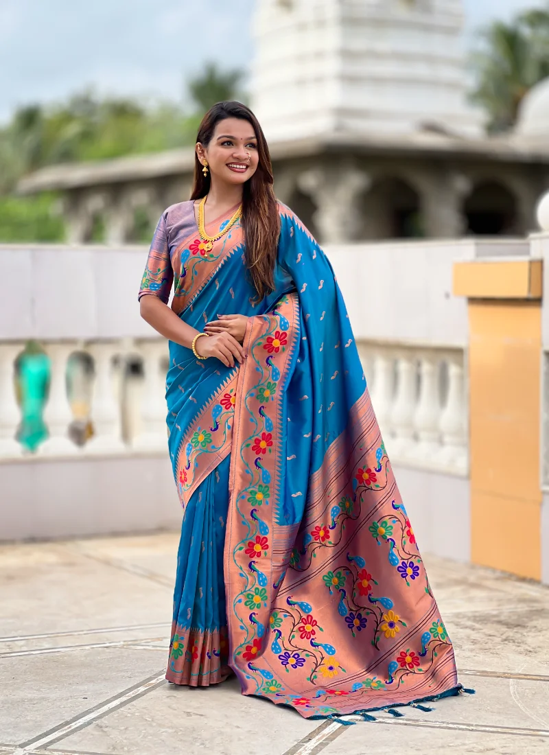 This saree showcases Zari weaving meenakari work, a rich pallu, elegant border detailing, and a coordinated blouse piece for a polished look. The Sky Blue Soft Paithani Silk Saree combines classic weaving aesthetics with versatile styling, making it a sophisticated choice for festive events and cultural gatherings.