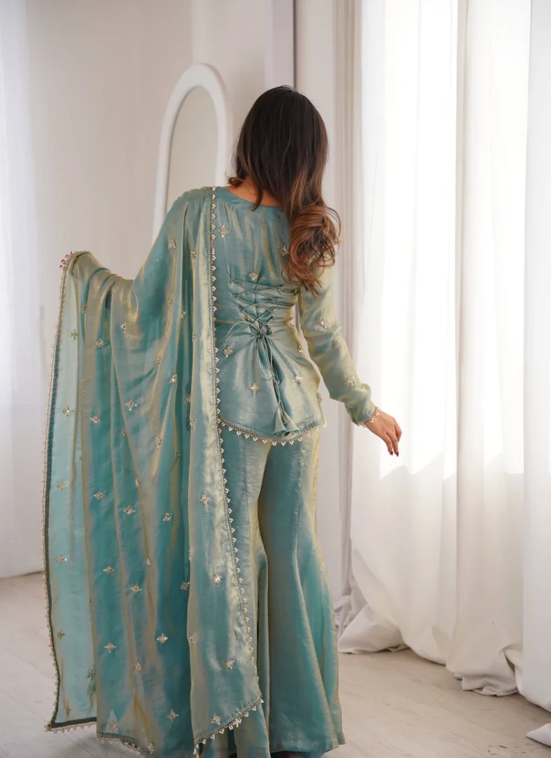 Teal Green Fendy Silk Embroidered Sharara Suit