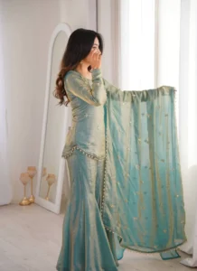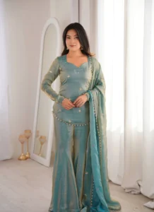 This fendy silk sharara suit in Teal Green is designed to bring a polished festive look with graceful movement and ready-to-wear comfort. Crafted with Fendy Silk, the coordinated set delivers a refined ethnic silhouette that works beautifully for celebrations, festive gatherings, family functions, and statement occasion dressing.