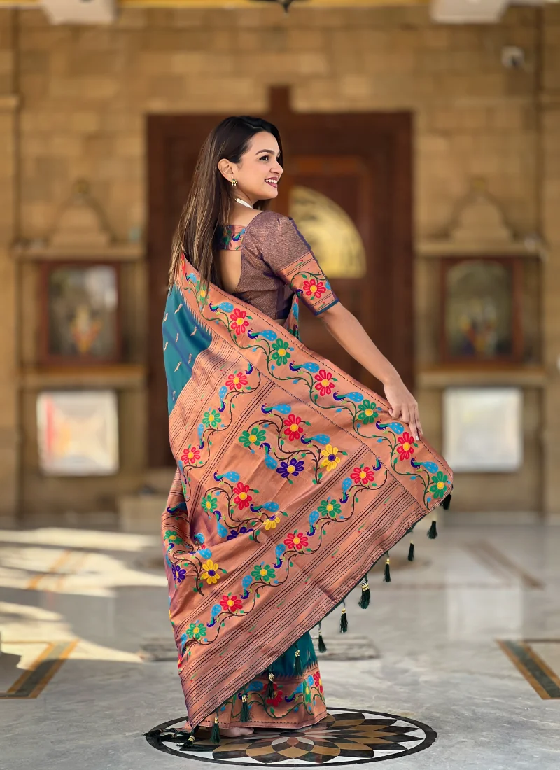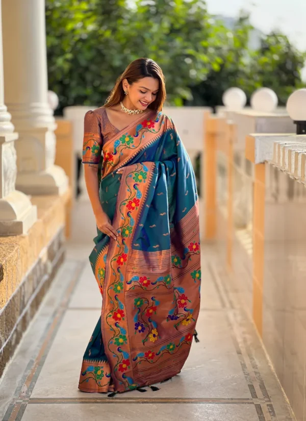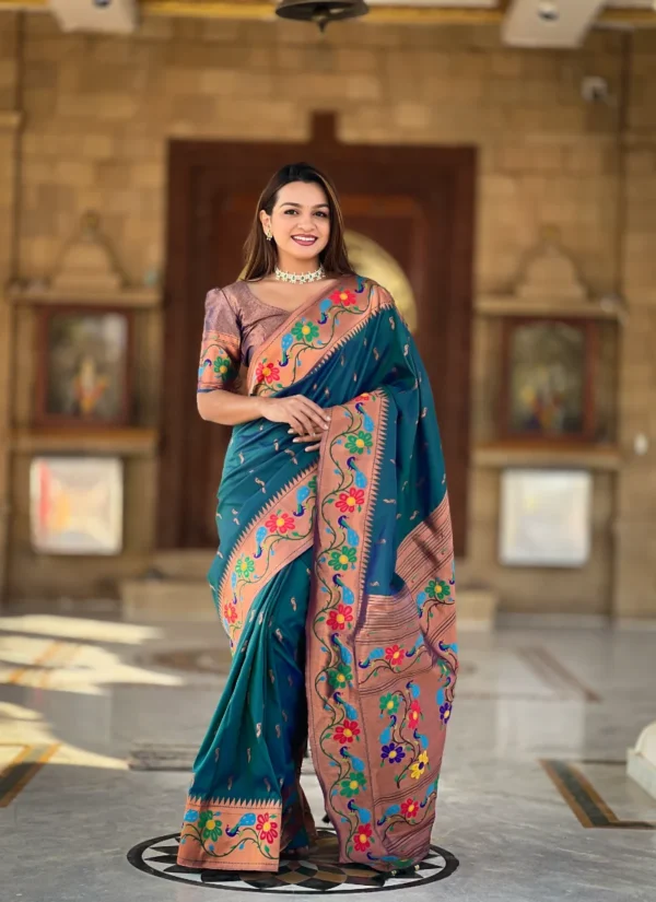 This saree showcases Zari weaving meenakari work, a rich pallu, elegant border detailing, and a coordinated blouse piece for a polished look. The Teal Rama Soft Paithani Silk Saree combines classic weaving aesthetics with versatile styling, making it a sophisticated choice for festive events and cultural gatherings.