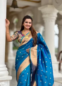 This turquoise soft Paithani saree is crafted in exact saree fabric name “Soft Paithani silk saree with zari” and offers a graceful traditional drape with woven zari appeal. The saree showcases Meenakari motifs, a rich pallu, weaving border detailing, and tassels at the pallu end for an elegant festive finish.