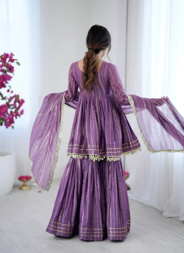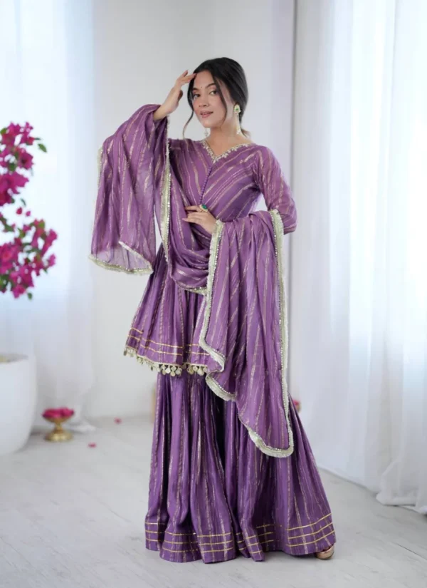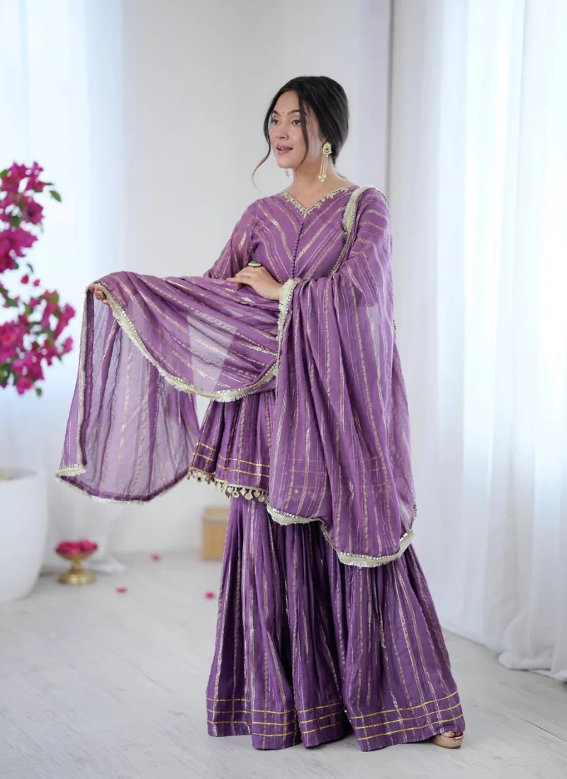 This mal chanderi sharara suit in Violet is designed to bring a polished festive look with graceful movement and ready-to-wear comfort. Crafted with Mal Chanderi, the coordinated set delivers a refined ethnic silhouette that works beautifully for celebrations, festive gatherings, family functions, and statement occasion dressing.
