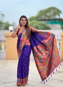 This saree showcases Zari weaving meenakari work, a rich pallu, elegant border detailing, and a coordinated blouse piece for a polished look. The Violet Soft Paithani Silk Saree combines classic weaving aesthetics with versatile styling, making it a sophisticated choice for festive events and cultural gatherings.