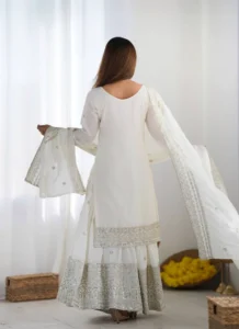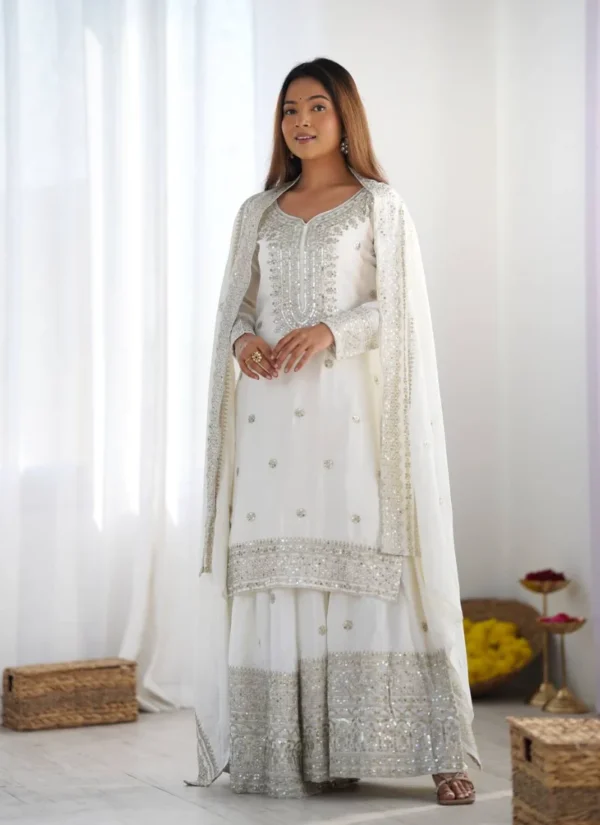 This chinnon silk sharara suit in White is designed to bring a polished festive look with graceful movement and ready-to-wear comfort. Crafted with Pure Heavy Chinnon Silk with Embroidery and 5mm Sequence Work, the coordinated set delivers a refined ethnic silhouette that works beautifully for celebrations, festive gatherings, family functions, and statement occasion dressing.