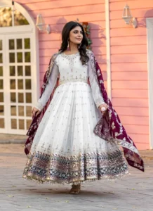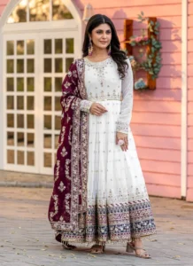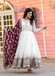With its coordinated styling and ready-to-wear finish, this Wine Faux Georgette Embroidered Anarkali Gown Set is an effortless choice for dressing up with confidence and comfort.