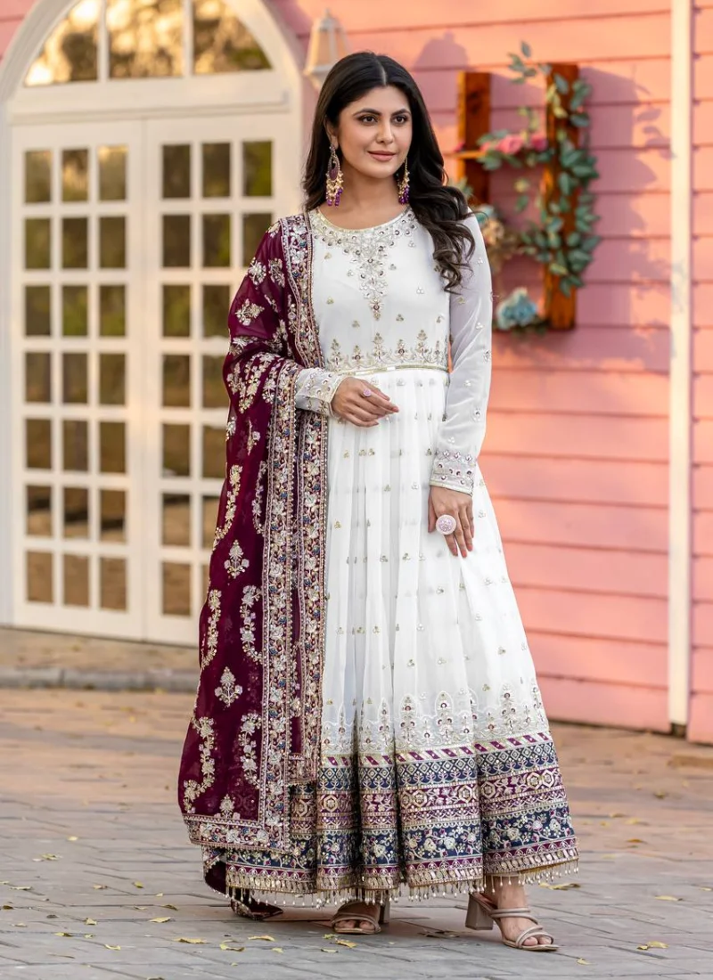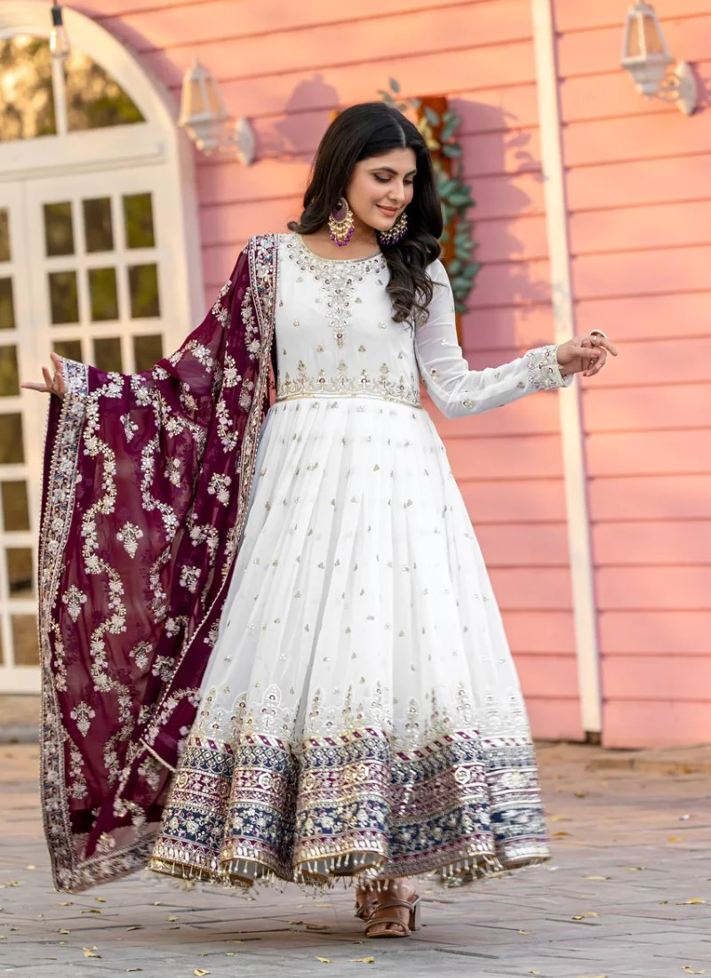 The faux georgette base gives the outfit a fluid drape, while the embroidered finish enhances its festive appeal. Designed in a flattering anarkali silhouette, this set offers a polished ethnic look that works beautifully for parties, celebrations, and wedding functions.